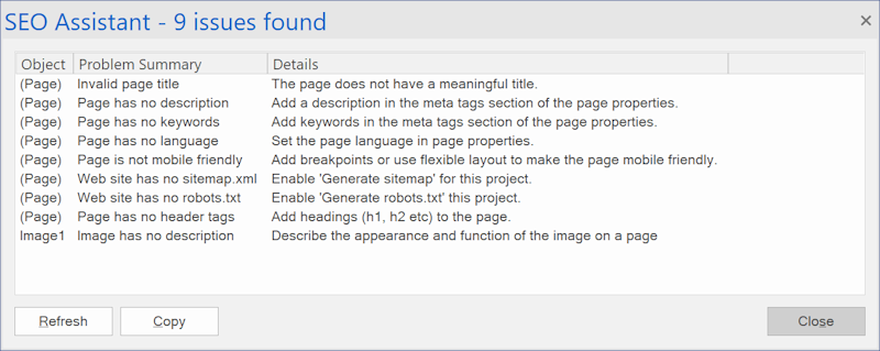 The SEO Assistant scans the page for missing image descriptions, keywords, sitemap.xml/robot.txt, header tags, broken links, mobile support and more. Double clicking one of the reported issues will either open the properties (meta tags, sitemap etc.) so you can fix the issue or select the object in the workspace. The SEO Assistant window is a 'modeless' window, which means that you do not have to close it to continue working on your website.