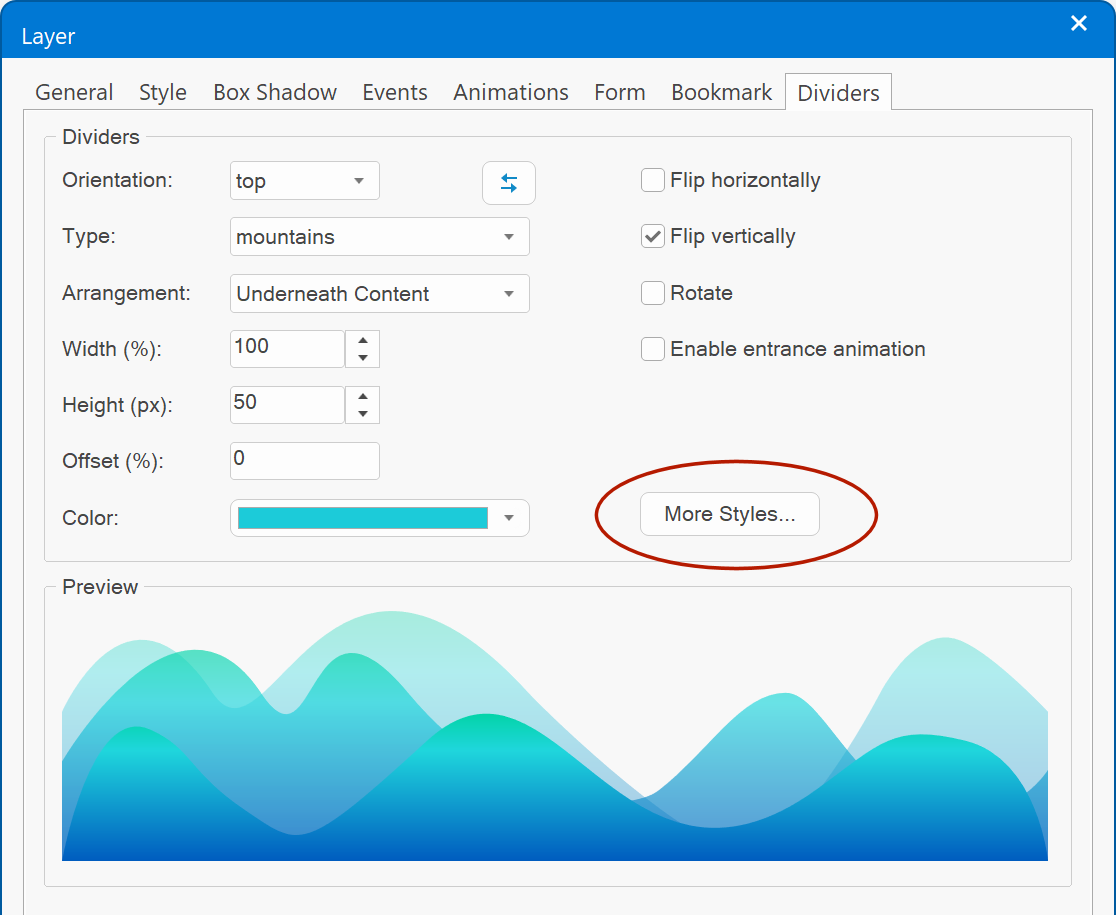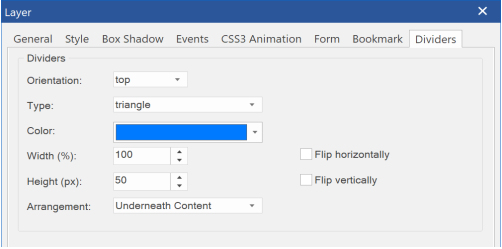 Shape dividers are SVG based shapes that can be used to separate the sections of a page. Shape divider are available in layers, layout grids and the flex box container. The dividers can be added at the top or bottom (or both) of a layer.