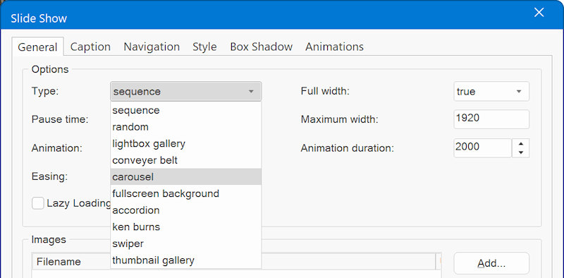 The Effect property specifies the animation that will be used for image transitions. You can choose from more that 25 animation effects!