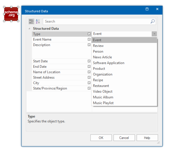 WYSIWYG Web Builder includes definitions for frequently used schemas. It does not include all possible properties because we think that would make the tool too complicated for 'standard' users. However, it is possible to modify the schemas yourself. The definitions are loaded from the file 'richsnippets.json' in the Program Files folder in JSON format. This file cannot be modified in this location because the file is protected by Windows. But you can create a customized version of the file by copying it to the Documents\WYSIWYG Web Builder\system folder. In that case WWB will load the customized file instead of the default version.