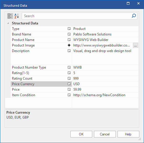Each schema has different values. In most cases, when you select a property the tool will display a hint for the expected value in the description field. For example, if you select 'Price Currency' then the description field will display 'USD, EUR, GBP'.