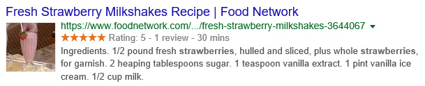 In this snippet, a picture of a milkshake is added, you can see the rating of the recipe, the time it takes to prepare the milkshake and other information.