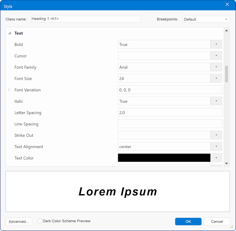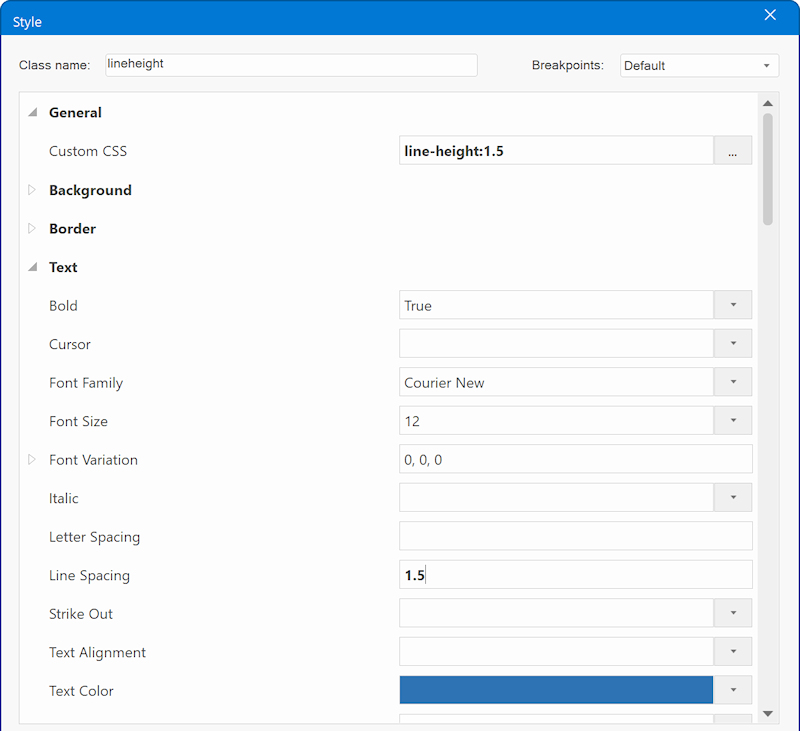 It's also possible to add custom style attributes. You may have noticed that we did this for the header styles (CustomStyle is display: inline), to make sure it is displayed correct in all browsers.