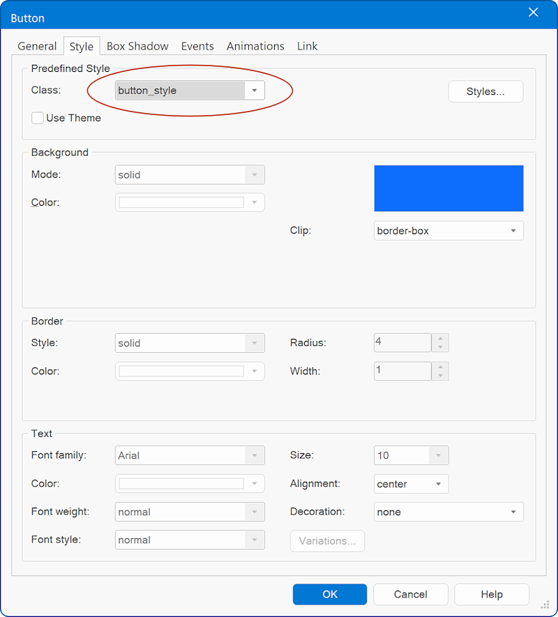 Most objects (like the Editbox, TextArea, Combobox, Buttons) do have a Class tab in their properties.