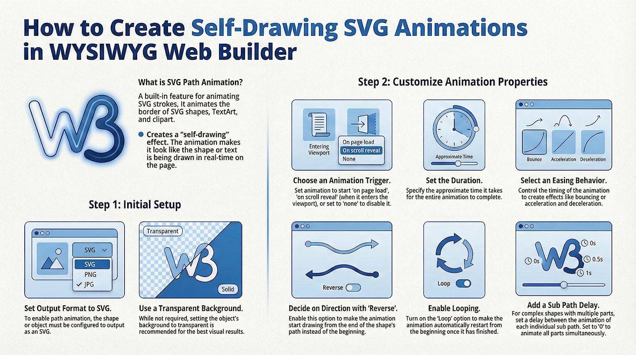 WYSIWYG Web Builder has built-in support for SVG Path animation. This animates the border (stroke) of SVG shapes, textart, clipart. This makes it look like the shape/text is drawing itself.`