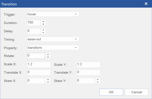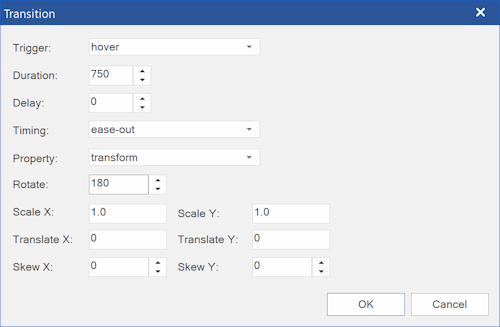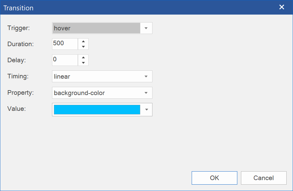 Trigger Specifies which state change will trigger the transition. Commonly used triggers are 'hover' and 'focus'.