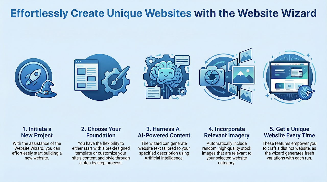 With the assistance of the 'Website Wizard,' you can initiate a new project. You have the flexibility to begin with a template as the foundation for your new project or customize its content and style through a step-by-step process. Moreover, there are options available to harness AI-driven content generation, tailored to your specified description, and incorporate (random) stock images relevant to your selected category. These features empower you to craft a distinct and unique website every time you utilize the wizard. The generated website will exhibit fresh variations with each run of the wizard!