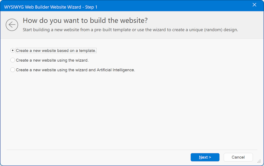 When choosing the "Create a new website using a wizard" option, the wizard will prompt you with a series of questions to determine the desired look and feel of your new website. The resulting website will feature a distinct design, generated based on your selections. Consequently, each time you utilize the wizard, you'll receive a one-of-a-kind website.
