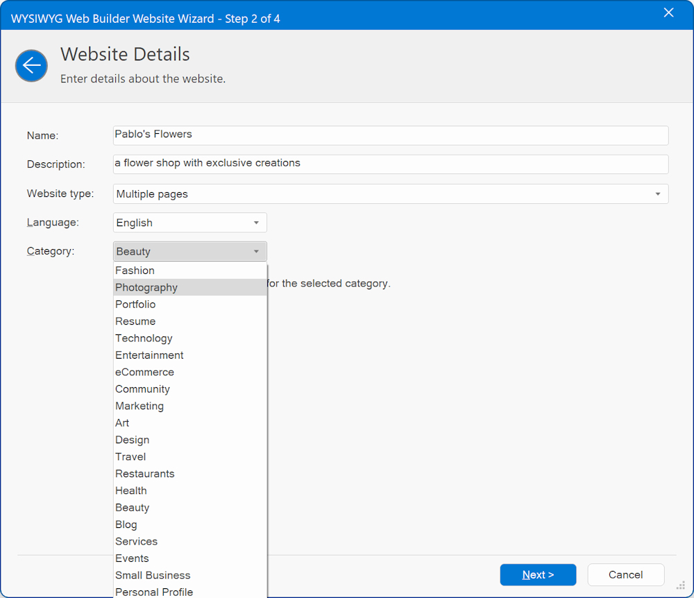 In the first step you can enter the Name of the website. For example: Pablo's Flowers