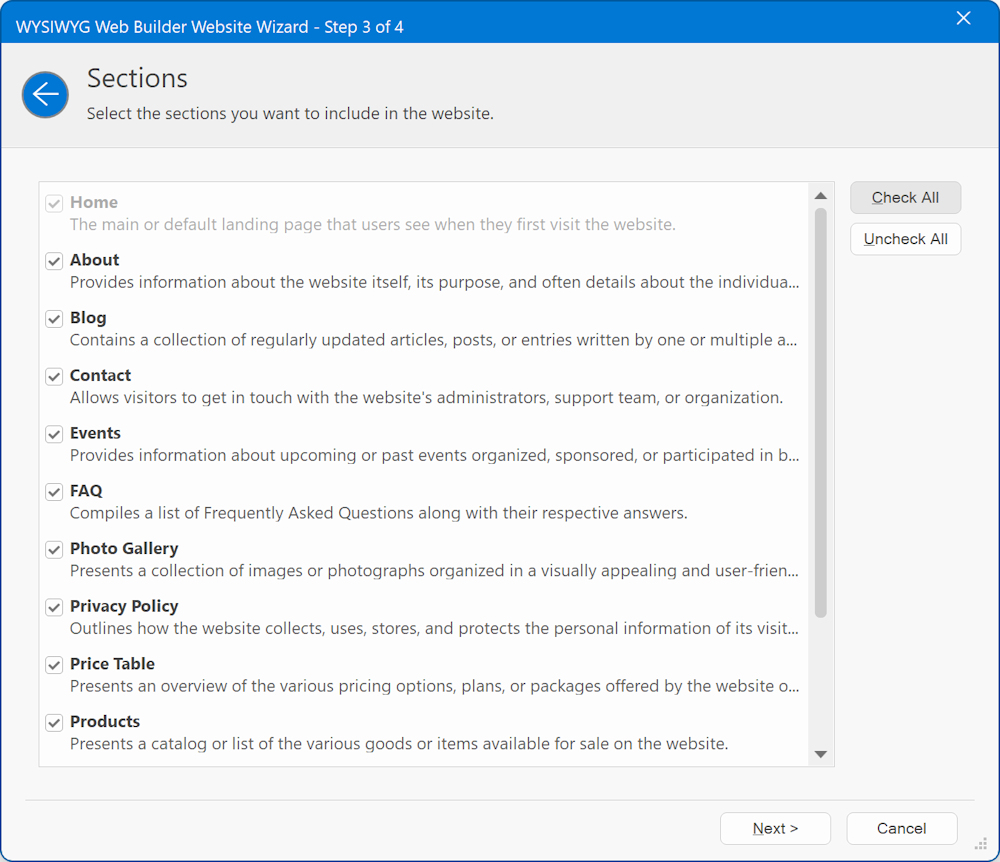 In the next step you can specify which sections you like to add the to website. For example, whether you want add an about section, contact form, photo gallery etc. Each section will also get an entry in the generated navigation. Of course, you can always add new pages later via the Site Manager.