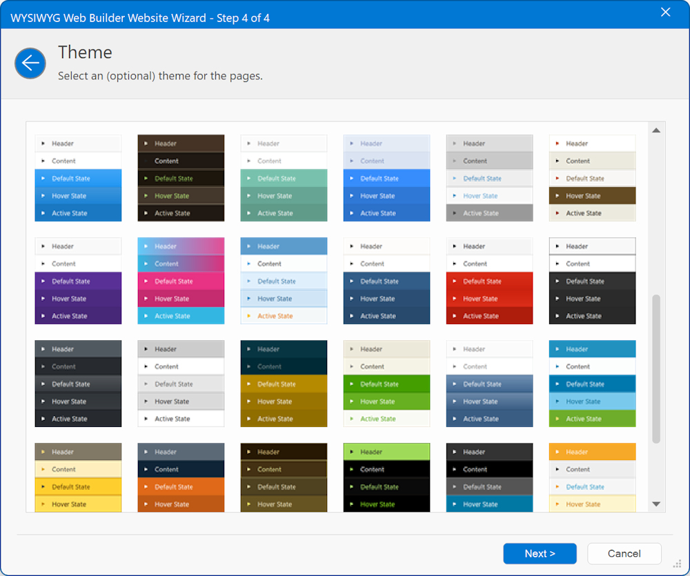 In the last step you can optionally select a theme for the website. The theme controls the main colors of elements on the pages.